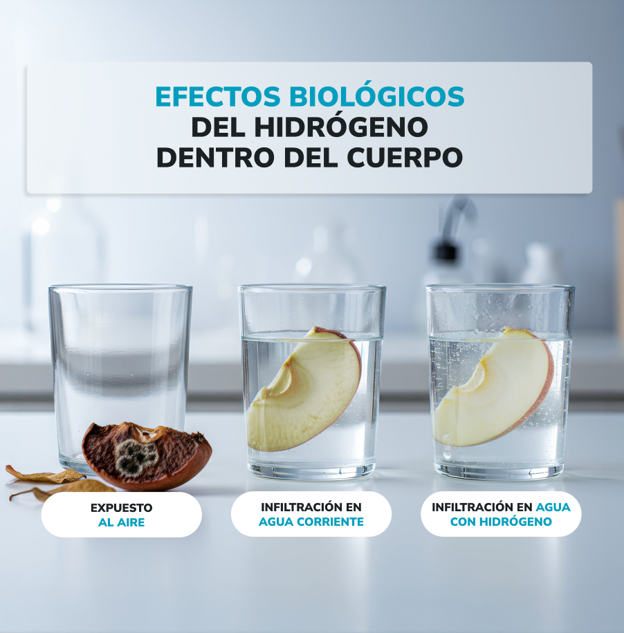 El agua rica en hidrógeno se une al oxígeno activo dañino de tu cuerpo, convirtiendo moléculas perjudiciales en agua inofensiva. Este proceso único protege tus células, restablece el equilibrio y apoya la salud a largo plazo desde el interior. Los estudios científicos han demostrado el papel del hidrógeno en la mejora de la función cerebral, el aumento de la energía, el apoyo a las articulaciones, la ayuda a la digestión e incluso el retraso de los signos del envejecimiento. Igual que en la prueba de la manzana, donde la fruta se mantiene fresca por más tiempo en agua hidrogenada, tu cuerpo también se beneficia de esta protección natural contra el estrés oxidativo.