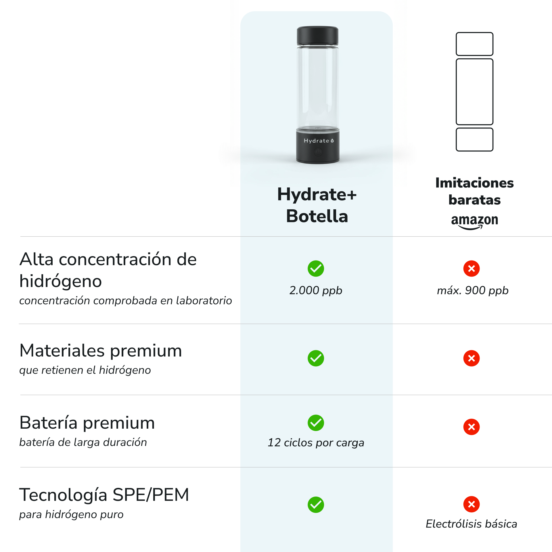 La botella Hydrate+ está diseñada para funcionar con prácticamente cualquier fuente: del grifo, filtrada o embotellada. Su tecnología avanzada enriquece tu agua con hidrógeno molecular, garantizando siempre el mismo resultado limpio y beneficioso para la salud.